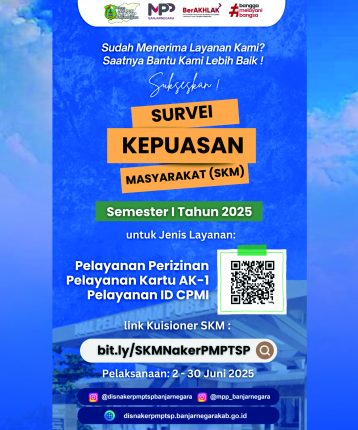 Kepada seluruh masyarakat pengguna layanan Disnaker PMPTSP Kabupaten Banjarnegara, Dalam rangka meningkatkan kualitas pelayanan publik, kami mengundang partisipasi aktif Anda untuk mengikuti Survei Kepuasan Masyarakat (SKM) Semester I Tahun 2025 terhadap layanan yang kami berikan, meliputi: Layanan Perizinan Layanan Kartu AK-1 Layanan ID Calon Pekerja Migran Indonesia Survei ini bertujuan untuk mengetahui tingkat kepuasan masyarakat […]